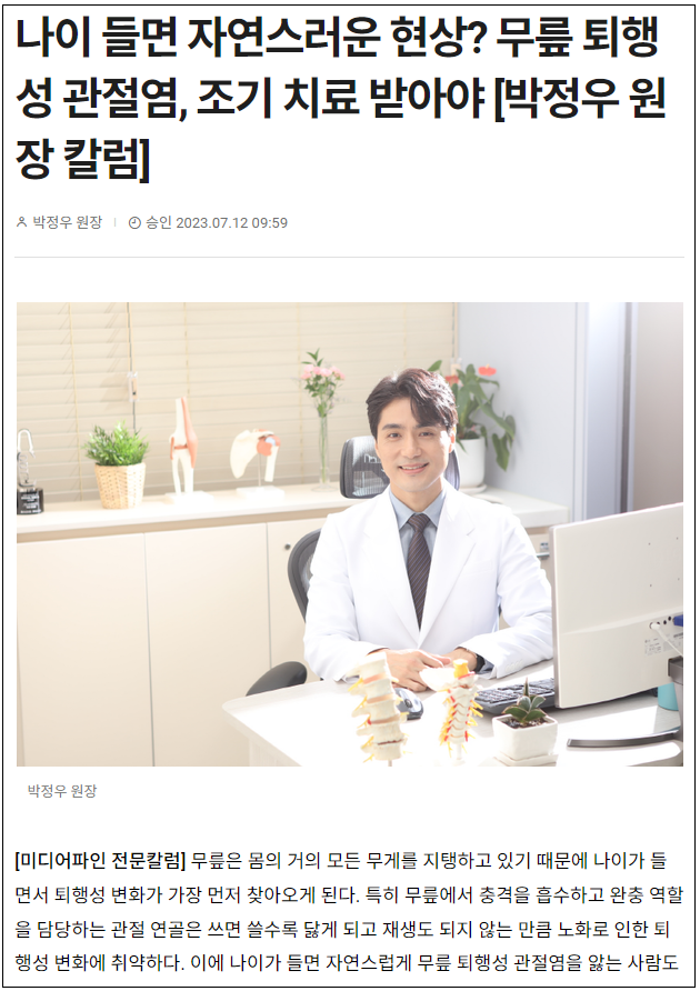 무릎은 몸의 거의 모든 무게를 지탱하고 있기 때문에 나이가 들면서 퇴행성 변화가 가장 먼저 찾아오게 되죠.