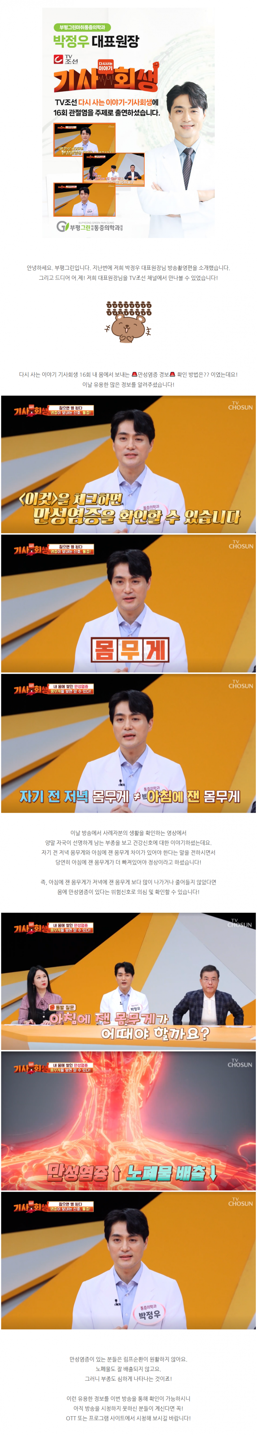 [공지사항] 다시 사는 이야기 기사회생 16회 박정우 대표원장님 출연 작성일 : 2023.05.16 부평그린마취통증의학과 댓글 : 0 조회 : 2,247 다시 사는 이야기 기사회생 16회 박정우 대표원장님 출연