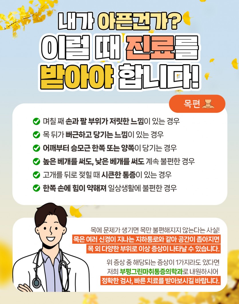 [공지사항] 내가 아픈건가? 이럴 때 진료를 받아야 합니다! - 목편 작성일 : 2023.10.10 부평그린마취통증의학과 댓글 : 0 조회 : 2,297 내가 아픈건가? 이럴 때 진료를 받아야 합니다! - 목편