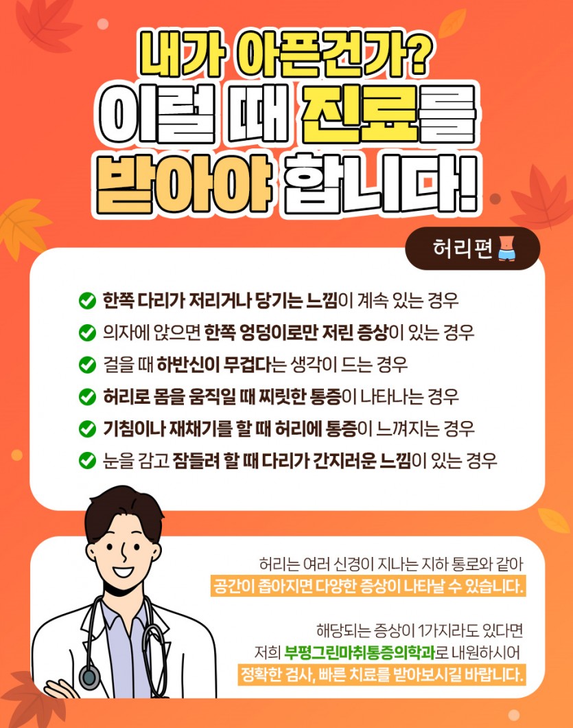 [공지사항] 내가 아픈건가? 이럴 때 진료를 받아야 합니다! - 허리편 작성일 : 2023.10.10 부평그린마취통증의학과 댓글 : 0 조회 : 2,233 내가 아픈건가? 이럴 때 진료를 받아야 합니다! - 허리편