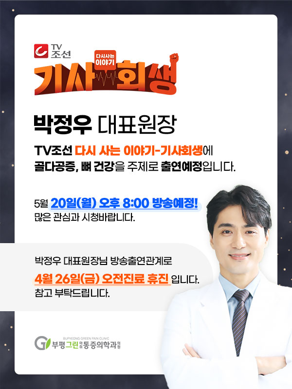 [공지사항] 5월 20일 박정우 대표원장님 TV조선 기사회생 출연 예정! 작성일 : 2024.04.18 부평그린마취통증의학과 댓글 : 0 조회 : 2,436 5월 20일 박정우 대표원장님 TV조선 기사회생 출연 예정! 그래서 4월 26일 금요일 오전진료는 휴진입니다. 내원에 불편이 없으시길 바라며, 많은 시청 바랍니다 ^^