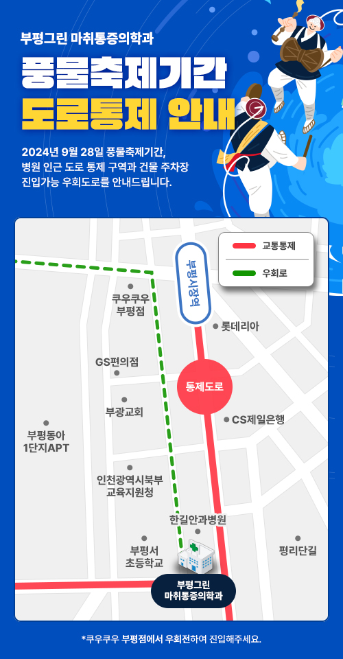 [공지사항] 주차장 진입가능 우회도로를 안내 작성일 : 2024.09.27 부평그린마취통증의학과 댓글 : 0 조회 : 2,462 안녕하세요, 부평그린통증의학과입니다. 9월 28-29일(토,일) 부평풍물대축제로 인해 병원 건물 주변 도로 통제가 있을 예정입니다. 28일 토요일 차량으로 내원해주시는 분들께서는 주차장 진입 시 우회 경로가 필요하니, 위 경로를 참고해 주시기 바랍니다. 안전하게 방문하셔서 통증 없이 축제도 즐기시길 바랍니다. 감사합니다.