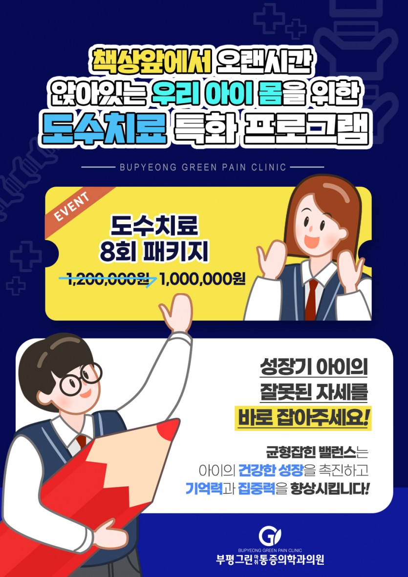 [공지사항] 책상 앞에서 오랜시간 앉아있는 우리 아이 몸을 위한 도수치료 특화 프로그램 작성일 : 2022.09.23 부평그린마취통증의학과 댓글 : 0 조회 : 2,354 책상 앞에서 오랜시간 앉아있는 우리 아이 몸을 위한 도수치료 특화 프로그램 성장기 아이의 잘못된 자세를 바로 잡아주세요! 균형잡힌 밸런스는 아이의 건강한 성장을 촉진하고 기억력과 집중력을 향상시킵니다!