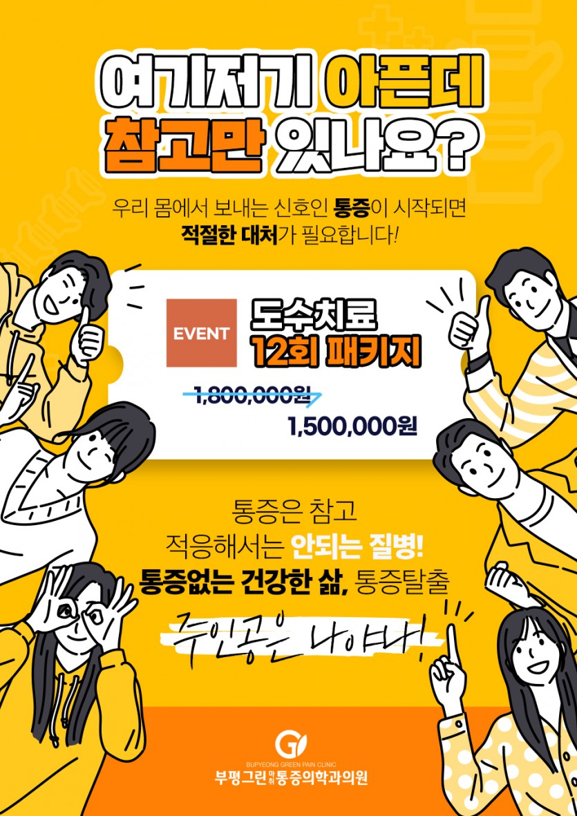 [공지사항] 여기저기 아픈데 참고만 있나요? 작성일 : 2022.09.23 부평그린마취통증의학과 댓글 : 0 조회 : 2,398 우리 몸에서 보내는 신호인 통증이 시작되면 적절한 대처가 필요합니다! 통증은 참고 적응해서는 안 되는 질병! 통증없는 건강한 삶, 통증탈출 주인공은 나야나!