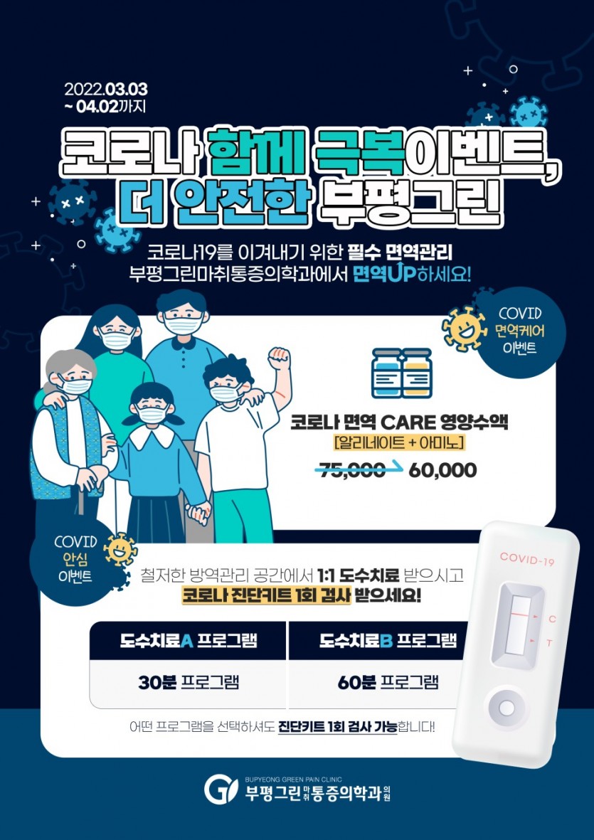 [공지사항] 코로나 극복 이벤트 부평그린이 함께 합니다! 작성일 : 2022.08.29 부평그린마취통증의학과 댓글 : 0 조회 : 2,055 코로나 극복 이벤트 부평그린이 함께 합니다!