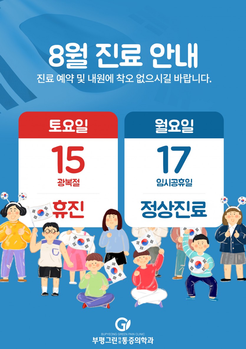 [공지사항] 8월 진료안내 (광복절) 작성일 : 2020.08.14 부평그린마취통증의학과 댓글 : 0 조회 : 3,025 안녕하세요. 부평그린마취통증의학과입니다. 8월 15일 광복절은 휴진이며, 8월 17일 임시공휴일은 정상진료합니다. 진료에 참고하시길 바랍니다. 감사합니다:)