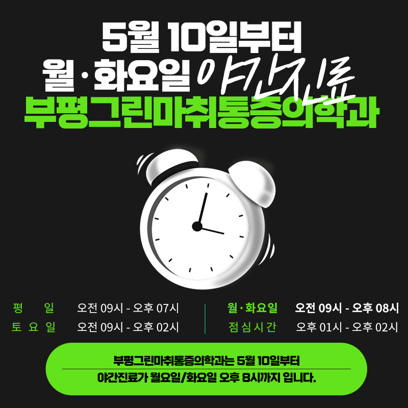 [공지사항] 5월 10일 부터 월·화 야간진료! 작성일 : 2021.05.12 부평그린마취통증의학과 댓글 : 0 조회 : 3,176 안녕하세요. 부평그린마취통증의학과입니다. 2021년 5월 10일부터 평일 야간 진료가 월요일, 화요일 오후 8시까지 입니다. 참고하셔서 내원하실 수 있습니다.