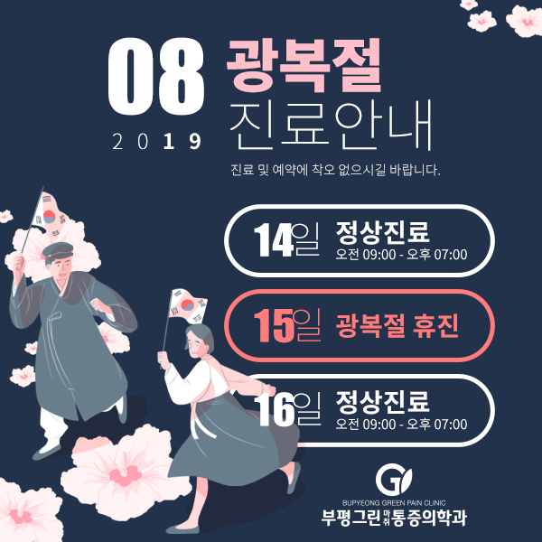 [공지사항] 2019년 8월 [광복절] 진료안내 작성일 : 2019.07.30 부평그린마취통증의학과 댓글 : 0 조회 : 3,268 부평그린마취통증의학과는 나라찾은 노고에 감사드리며, 존경과 예우를 표합니다. 2019년 8월 15일 진료 휴진입니다. 진료와 예약에 착오없으시길 바랍니다. 감사합니다:)