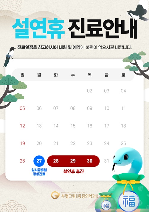 [공지사항] 2025년 설연휴 공지드립니다. 작성일 : 2025.01.27 부평그린마취통증의학과 댓글 : 0 조회 : 1,366 안녕하세요. 2025년 새해 복 많이 받으세요 ^^ 진료일정 확인하시어 내원에 불편이 없으시길 바랍니다.