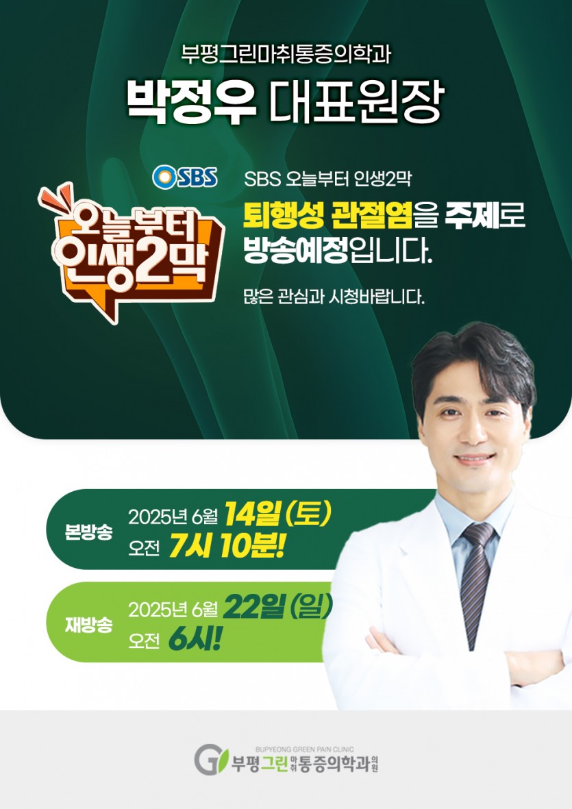 [공지사항] SBS 오늘부터 인생2막 퇴행성관절염 주제로 방송예정입니다. 작성일 : 2025.05.26 부평그린마취통증의학과 댓글 : 0 조회 : 1,159 SBS 오늘부터 인생2막 퇴행성관절염 주제로 방송예정입니다. 많은 관심과 시청바랍니다:-)