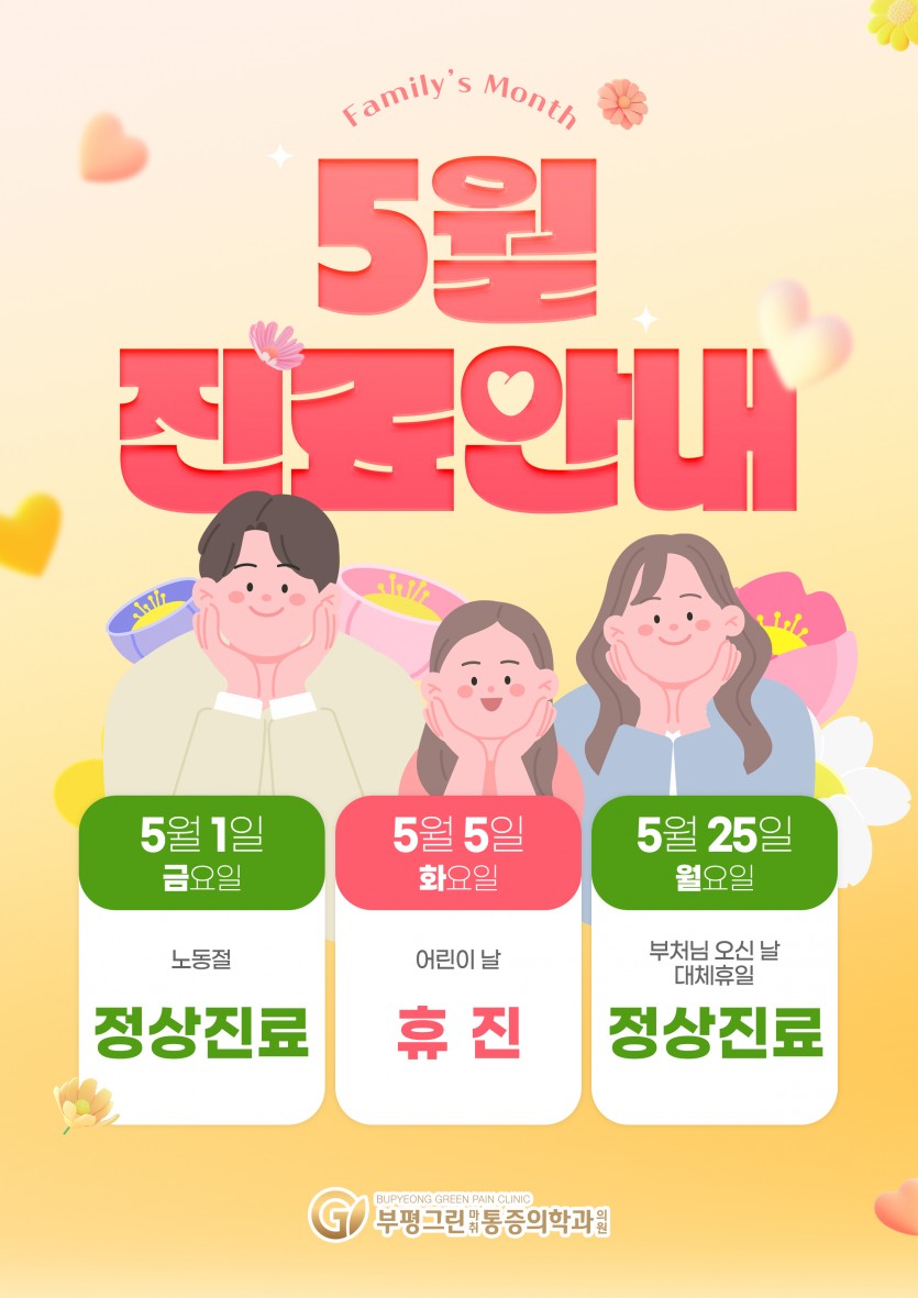 [공지사항] 5월 진료안내드립니다. 작성일 : 2026.04.21 부평그린마취통증의학과 댓글 : 0 조회 : 104 5월 진료안내드립니다. 진료일정 참고하시어 내원에 불편이 없으시길 바랍니다.